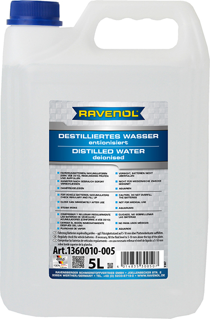 Специально приготовленная дистиллированная (деионизированная) вода RAVENOL Destilliertes Wasser (entionisiert). Не содержит ионов.