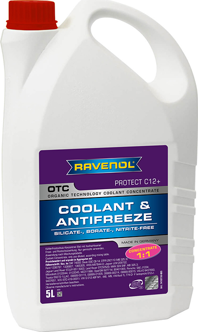 Красный антифриз концентрат RAVENOL OTC Protect C12+ Concentrate -40C соответствует стандарту G12+ и обеспечивает долговременную защиту алюминиевого двигателя как зимой, так и летом.