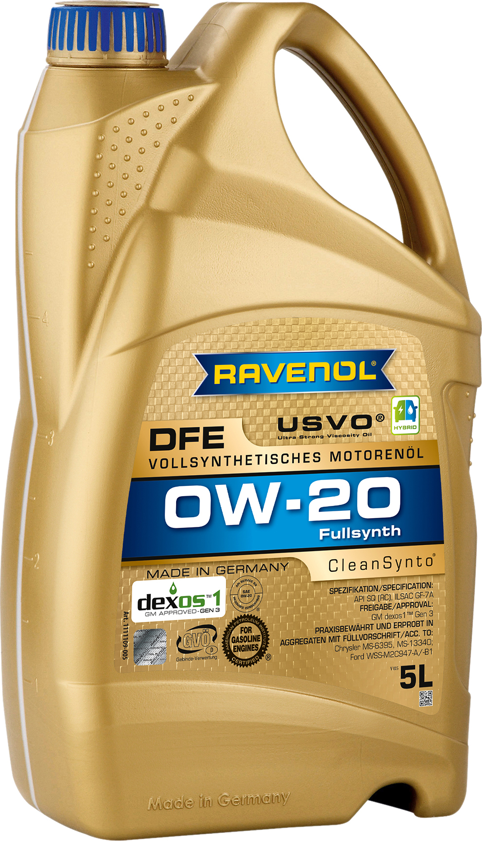Полностью синтетическое ПАО масло RAVENOL DFE 0W-20 для легковых автомобилей Opel, GM, Chevrolet, Daewoo, Holden, Ford, Chrysler и других, требующих применения моторных масел вязкостью 0W-20 уровня качества GM dexos® 1 Gen 3 или ILSAC GF-6A / ILSAC GF-7A , API SP / API SQ.