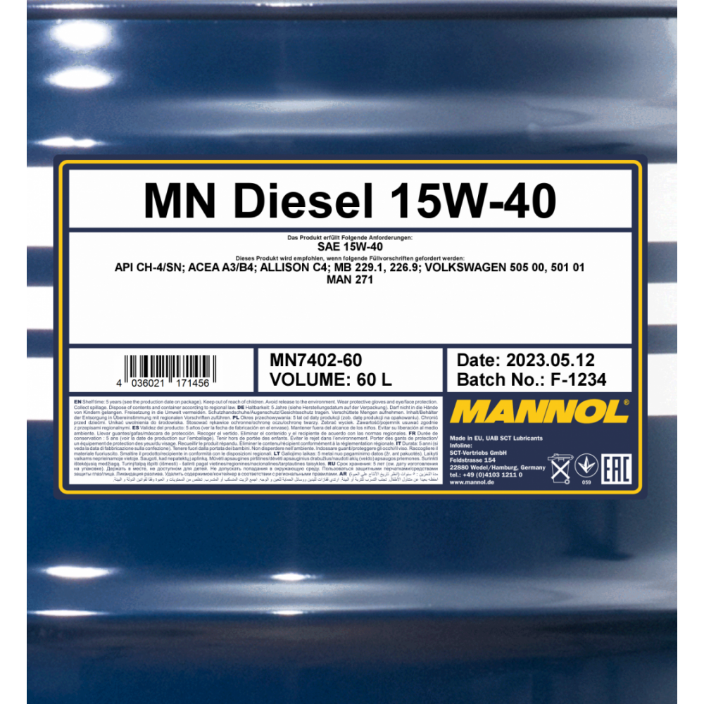 MANNOL 7402 DIESEL 15W-40 - всесезонное моторное масло эконом-класса на высокоочищенной минеральной основе для высокофорсированных дизельных двигателей с турбонаддувом и без, с очень большим пробегом, работающих в различных условиях эксплуатации.