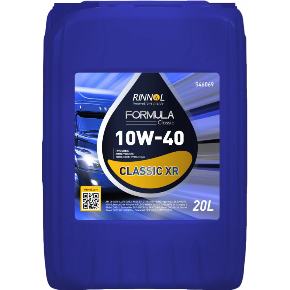 RINNOL FORMULA Classic XR 10W-40 - высококачественное моторное масло на синтетической основе, разработанное для максимального удовлетворения потребностей в высокой производительности тяжелонагруженных дизельных двигателей. Благодаря специально разработанной формуле сохраняет двигатель в чистоте, защищая его от коррозии даже в случае использования топлива с высоким содержанием серы.