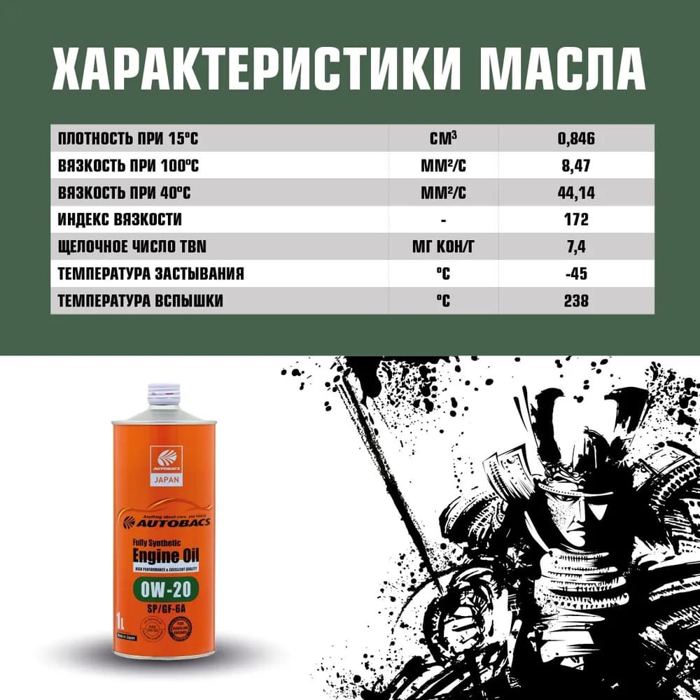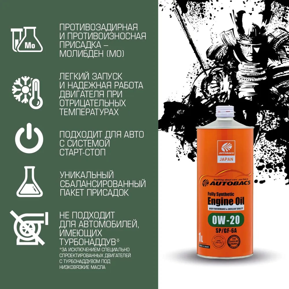 AUTOBACS Fully Synthetic 0W-20 SP/GF-6A - полностью синтетическое моторное масло AUTOBACS 0W-20 SP/GF-6A. Разработано с учетом новых требований по API и одобренного согласно экологического стандарта.