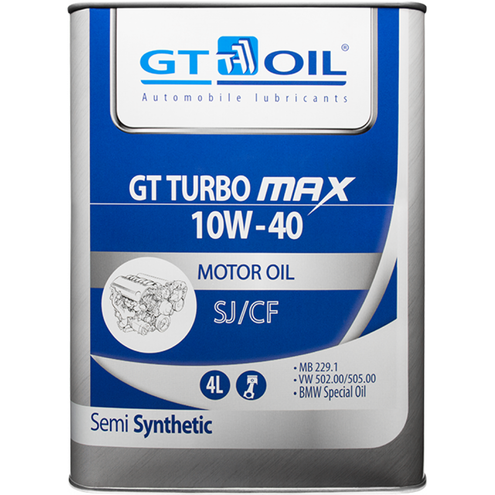 GT OIL GT Turbo Max 10W-40 SJ/CF - высококачественное всесезонное полусинтетическое моторное масло, отвечающее современным требованиям автомобилестроения. GT Turbo Max разработано на основе передовых технологий - гидрокрекинговых базовых масел высокой вязкости и современных присадок. Обеспечивает уникальные эксплуатационные характеристики: увеличивает срок службы двигателя при высокой экономии топлива. Соответствует требованиям европейских стандартов ACEA A3/B4 и американских стандартов API SJ/CF. Обеспечивает стабильно высокие защитные свойства при обкатке и в основной период эксплуатации двигателя. Гарантирует экономию топлива за счет уменьшения потерь на трение, особенно при запуске двигателя и на режиме холостого хода.