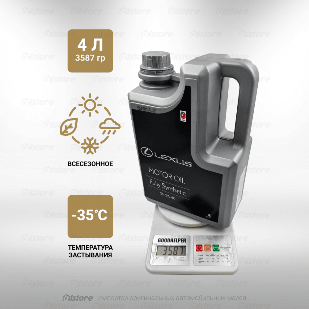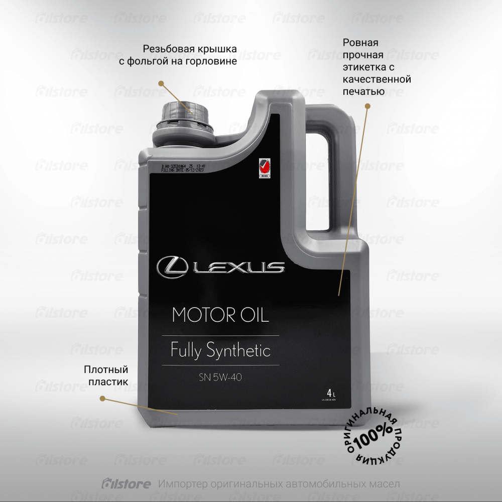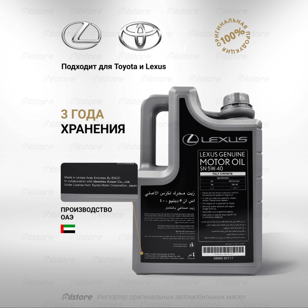 Lexus Motor Oil SN 5W-40 - синтетическое оригинальное моторное масло. Разработано специально для применения в бензиновых двигателях автомобилей Toyota и Lexus, где производителем предписано использовать масло с вязкостью SAE 5W-40, отвечающее классификации по API SN.
