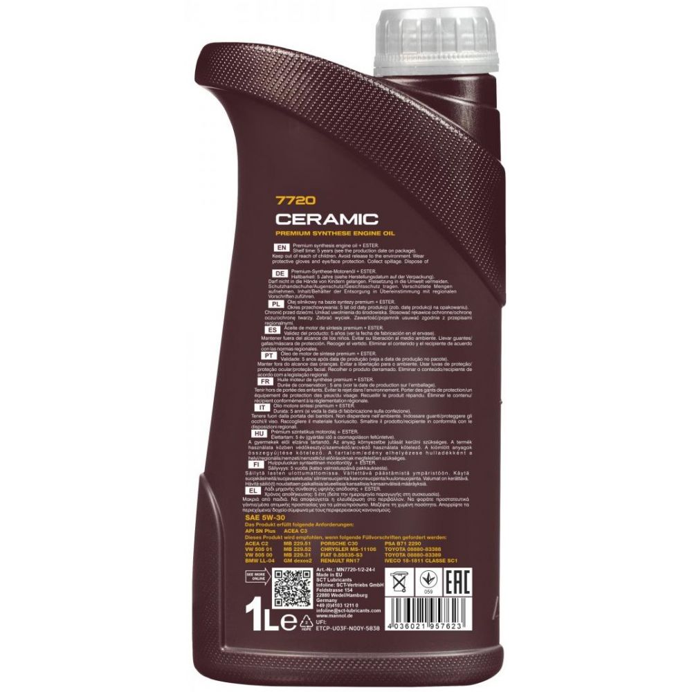 MANNOL 7720 CERAMIC 5W-30 - уникальное инновационное полностью синтетическое моторное масло премиум-класса со специальными противозадирными свойствами за счёт добавления синтетических сложных эфиров (esters) и гексагонального нитрида бора h-BN (белого графита). Подходит ко всем видам автомобильных двигателей – дизельным и бензиновым, имеющим систему смазки.