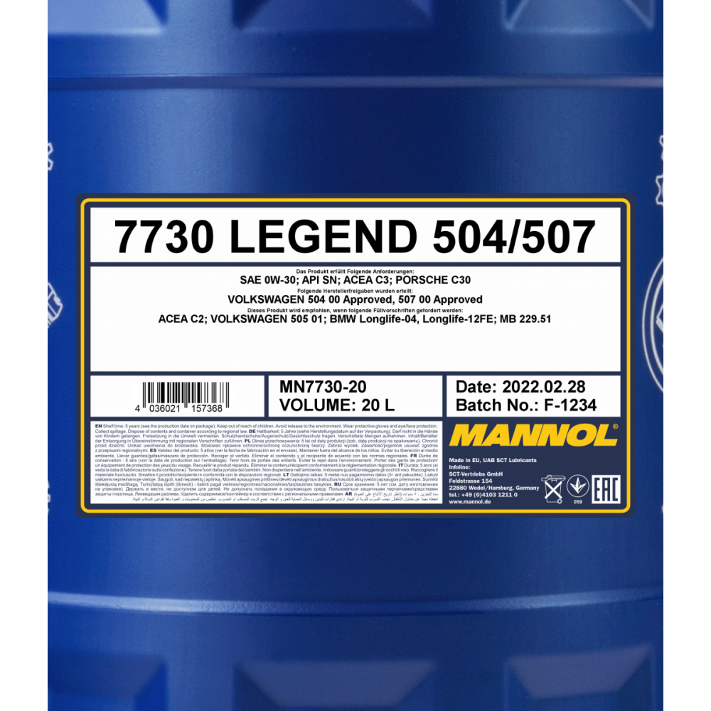 Моторное масло MANNOL 7730 LEGEND 504/507 0W-30, 20л