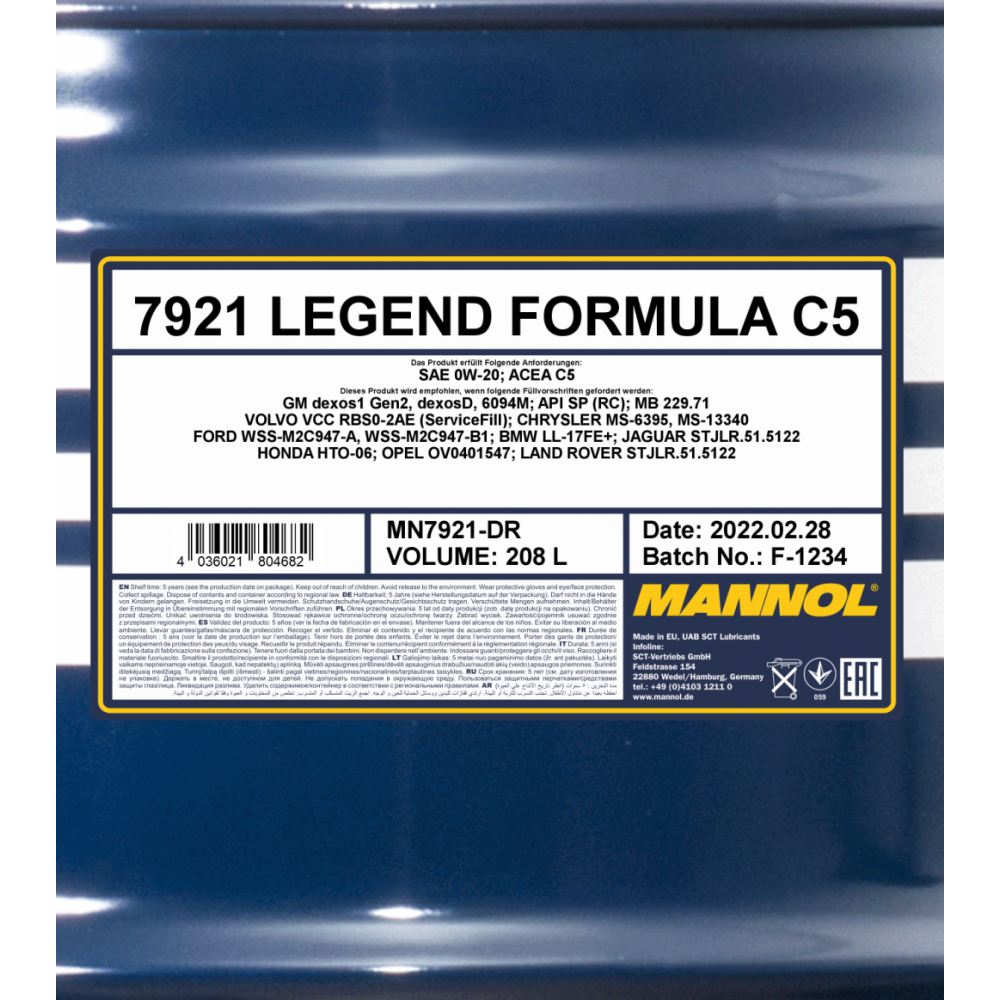 MANNOL 7921 LEGEND FORMULA C5 0W-20 - инновационное энергосберегающее низковязкое би-синтетическое (PAO+esters) моторное масло премиум-класса для последних моделей бензиновых двигателей (с распределённым или непосредственным впрыском) с турбонаддувом и оборудованных сажевыми фильтрами.