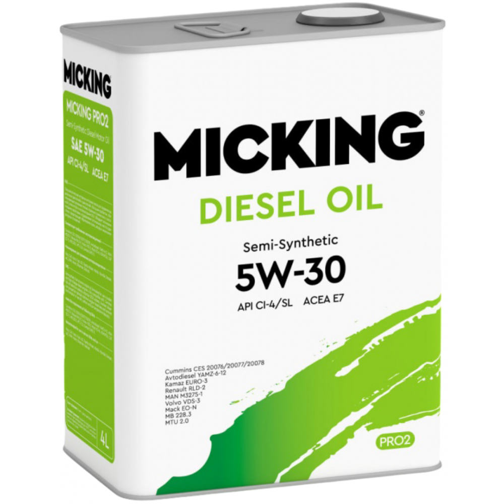 MICKING Diesel Oil PRO2 5W-30 CI-4/SL - полусинтетическое моторное моторное масло для современных дизельных двигателей и двигателей с большим пробегом, обеспечивающее экономию топлива. Обладает отличными моющими свойствами, поддерживает оптимальную чистоту двигателя, предотвращает образование лаков, нагара и низкотемпературных отложений.