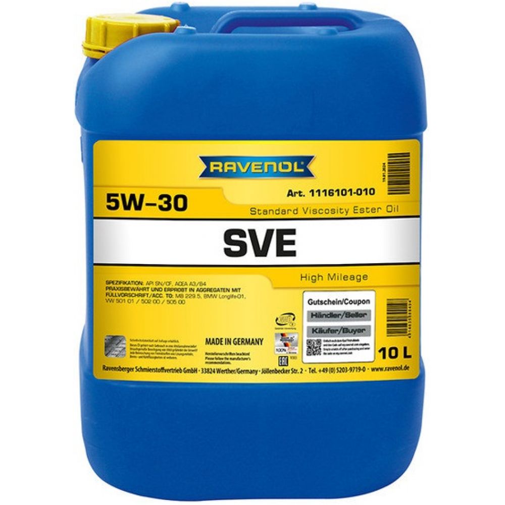 RAVENOL SVE Standard Viscosity Ester Oil 5W-30 - полусинтетическое моторное масло, разработанное по новой рецептуре, специально для автомобилей с пробегом свыше 100000 км. Благодаря специальному комплексу присадок, применяемых в рецептуре, восстанавливает критические узлы двигателя и защищает уплотнители. Увеличивает срок службы двигателя, снижает расход масла и обеспечивает защиту от пенообразования и износа. Гарантирует чистоту двигателя.