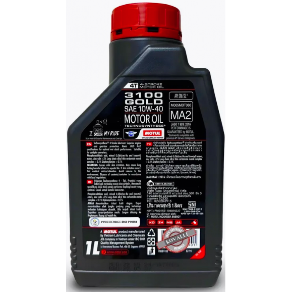 MOTUL 3100 GOLD 4T 10W-40 - моторное масло Technosynthese®. Данное моторное масло Motul разработано с использованием сбалансированного пакета присадок. Стандарт API SM был разработан для обеспечения лучшей стойкости к окислению и улучшенной защиты от отложений, низкого износа компонентов и улучшенными низкотемпературными характеристиками в течение всего срока службы двигателя. JASO (Японская организация по автомобильным стандартам) разработала свой собственный стандарт на моторные масла для 4-х тактных мотоциклов - JASO T903: 2023. Данный стандарт регламентирует требования к моторным маслам, учитывая характеристики двигателя, характеристики сцепления, физико-химические свойства. Спецификация JASO MA2 обеспечивает наиболее эффективные значения трения для обеспечения наилучшего сцепления во всех режимах езды. Легкое переключение передач.