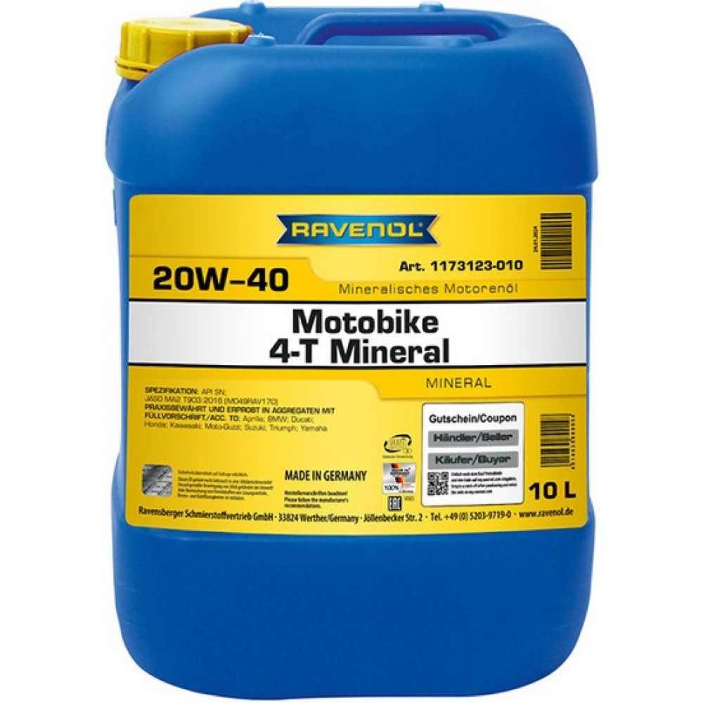 RAVENOL Motobike 4-T Mineral 20W-50 - минеральное современное моторное масло, специально разработанное для 4-х тактных двигателей мотоциклов. Масло с повышенным содержанием противоизносного пакета присадок EP (Extreme-Pressure) для коробок передач, раздаточных коробок и рулевых механизмов, а также для тяжелонагруженных трансмиссий.