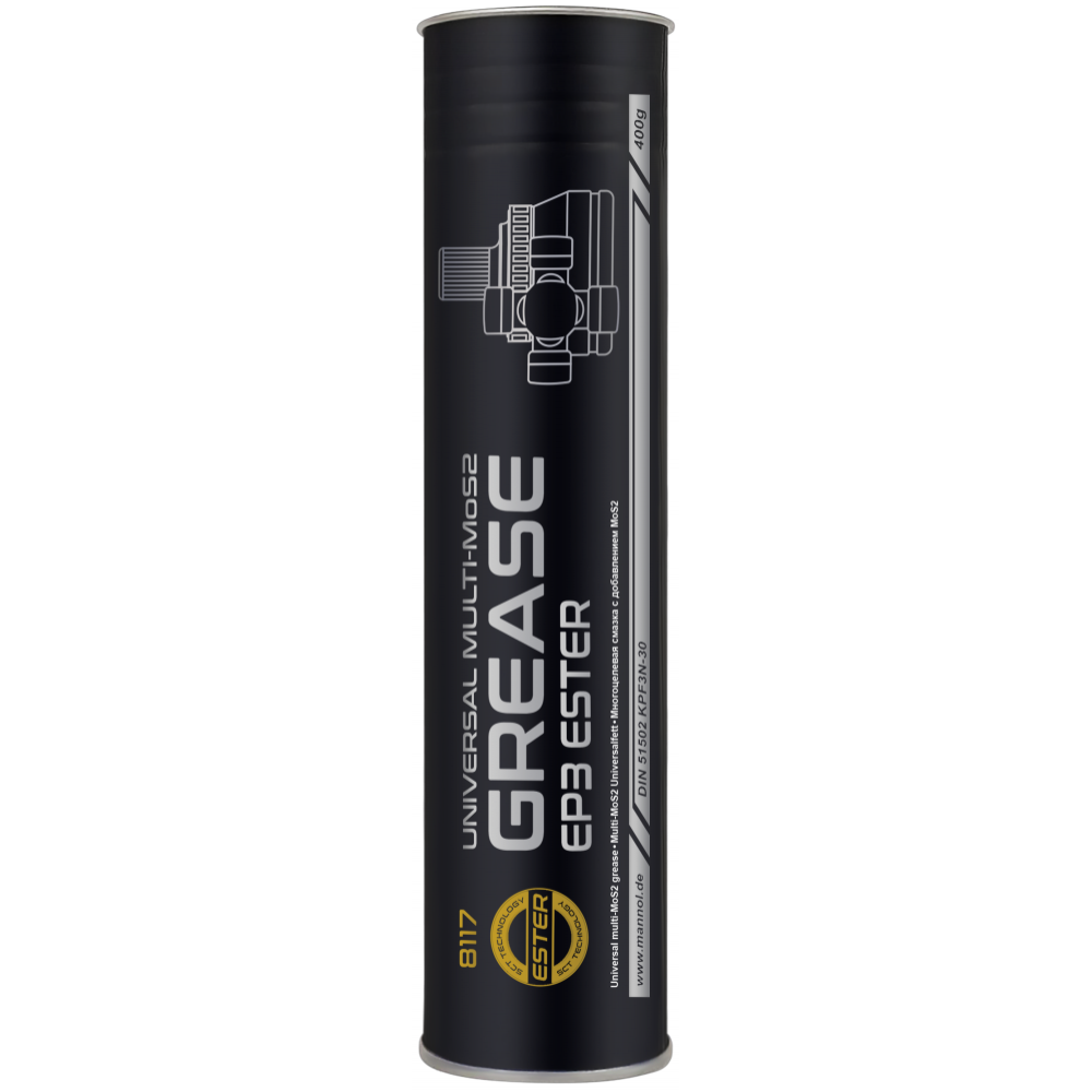 MANNOL 8114 UNIVERSAL MULTI-MoS2 GREASE EP-3 - универсальная многоцелевая противозадирная пластичная литиевая смазка на основе высокоочищенного минерального базового масла с добавлением противоизносных и противозадирных ЕР-добавок (EP -Extreme Pressure) дисульфида молибдена и смазочного графита, обладающая высокой термостойкостью, герметизирующей способностью и обеспечивающая отличные антифрикционные и противозадирные характеристики.