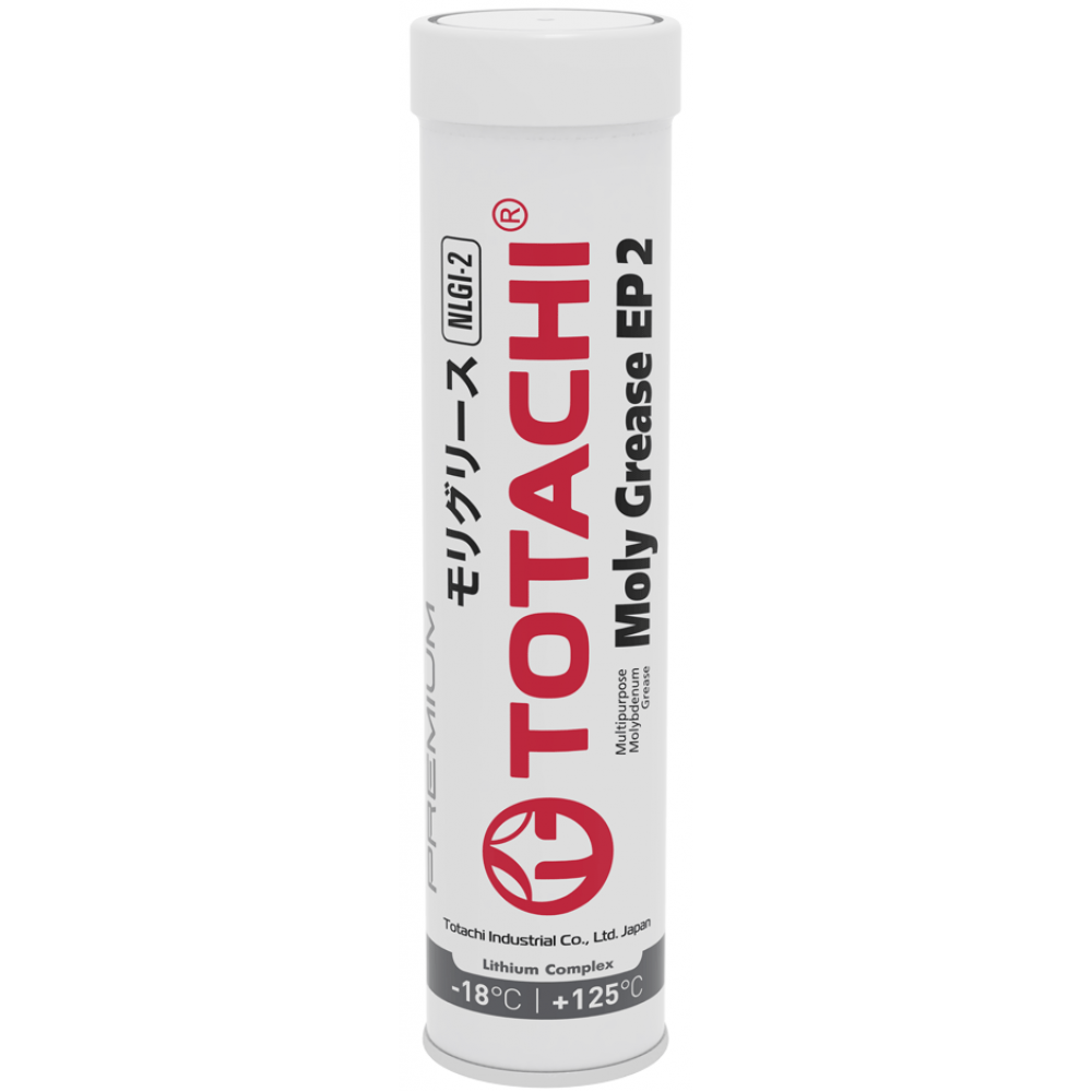 TOTACHI MOLY GREASE EP 2 - противозадирная пластичная смазка с содержанием дисульфида молибдена для максимальной защиты высоконагруженных подшипников, работающих в экстримальных условиях с ударными шоковыми нагрузками. Производится на основе загустителя из литиевого комплекса и средневязких базовых масел с добавлением комплексных присадок Extreme Pressure, обладающего синергетическим эффектом. Содержит мелкоизмельченные частицы графита и дисульфида молибдена, а так же антиокислительные присадки и ингибиторы коррозии в целях обеспечения превосходных защитных свойств в экстримальных условиях эксплуатации. Твердые частицы дисульфида молибдена и графита предотвращают контакт поверхностей подвижных деталей, даже если смазка "уходит" из зазора под воздействием чрезвычайно высокого давления и температуры. Смазка обладает характерным черным цветом.