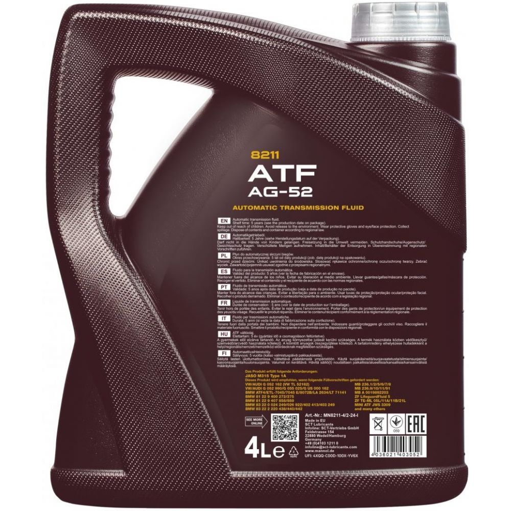 MANNOL 8211 ATF AG52 - специальное всесезонное трансмиссионное синтетическое масло (ATF) для современных 4-5 ступенчатых автоматических коробок передач (АКПП) концерна ZF. Не походит для 6-ступенчатых АКПП. Обеспечивает бесперебойную работу АКПП, гарантирует минимальный износ, продолжительный срок службы трансмиссий и экономию топлива даже при максимальных нагрузках. Разработано с учетом специальных требований концерна VW G 052 162.