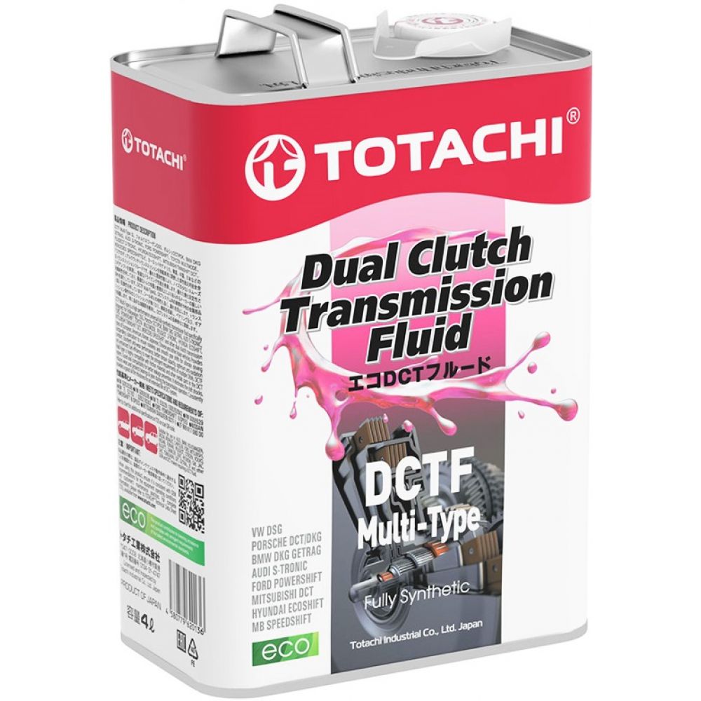 TOTACHI DCTF MULTI-TYPE - многоцелевая, полностью синтетическая трансмиссионная жидкость для коробок передач с высокими эксплуатационными характеристиками. Продукт разработан для Volkswagen DSG, Porsche DCT/PDK, BWW DKG GETRAG, AUDI S-TRONIC, FORD POWERSHIFT, TOYOTA MULTIMODE, PEGEOUT 2-TRONIC, HYUNDAI ECOSHIFT, MITSUBISHI TWINSHIFT DCT, MERCEDES SPEEDSHIFT и других коробок передач с двойным сцеплением европейских, американских, корейских, японских, китайских и других азиатских автомобилей.