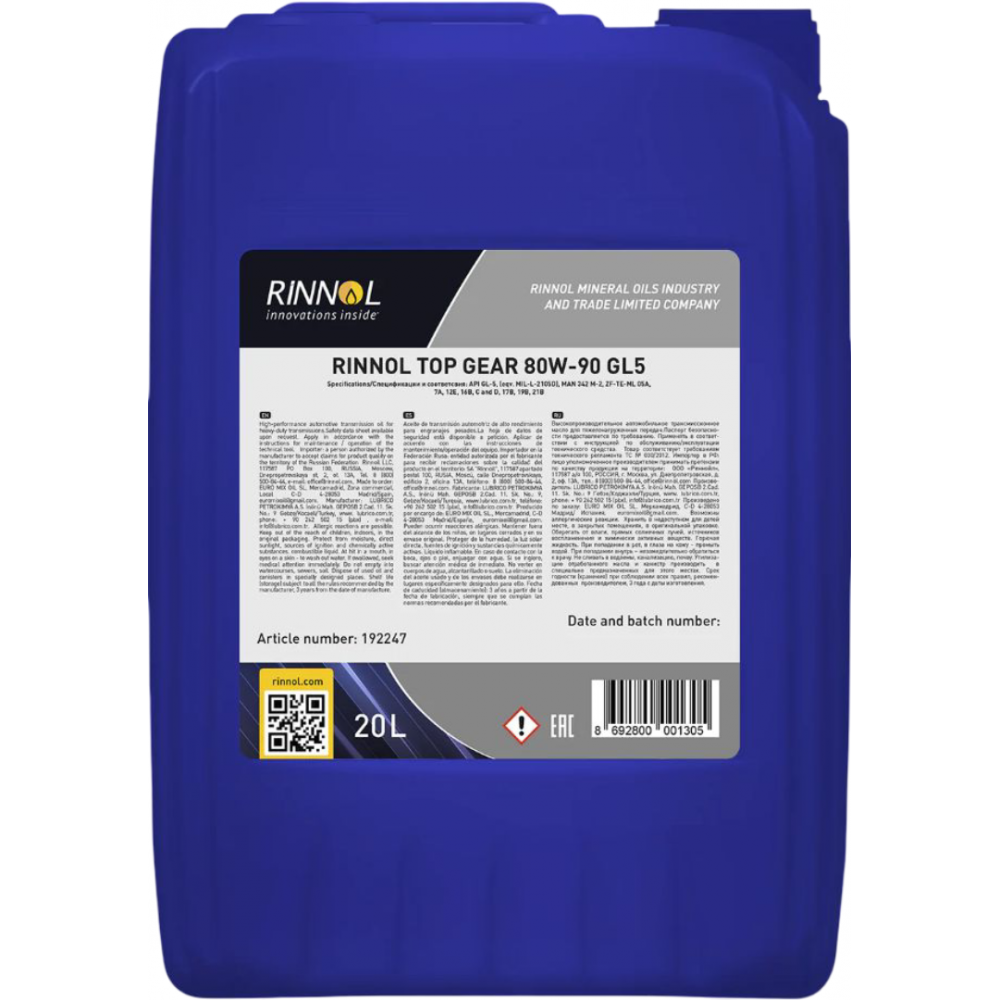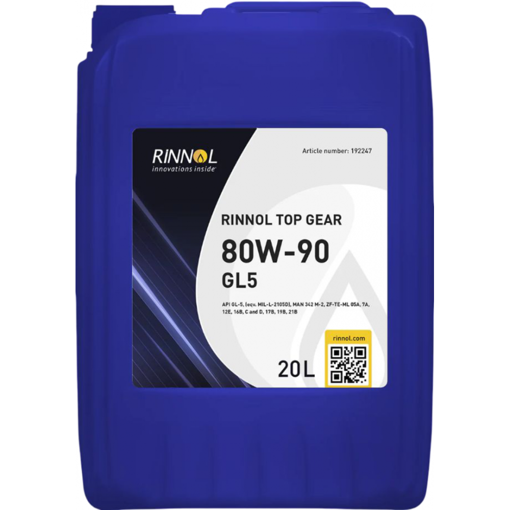RINNOL TOP GEAR 80W-90 GL-5 - высокопроизводительное автомобильное трансмиссионное масло для тяжелонагруженных передач. Использование качественных базовых масел, улучшенного пакета присадок и специальная формула обеспечивает самую эффективную защиту от износа при тяжелых условиях эксплуатации.