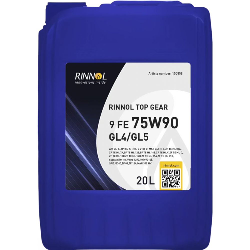 RINNOL TOP GEAR 9 FE 75W-90 GL-4/G-L5 - высокоэффективное синтетическое универсальное трансмиссионное масло для всех агрегатов механических трансмиссий от коробок передач до редукторов главных передач, включая гипоидные. Благодаря применению высококачественных базовых масел и передового пакета присадок масло имеет отличную низкотемпературную текучесть и стабильность при высоких температурах, обеспечивающие прекрасную защиту от износа элементов трансмиссии в широком диапазоне рабочих нагрузок.