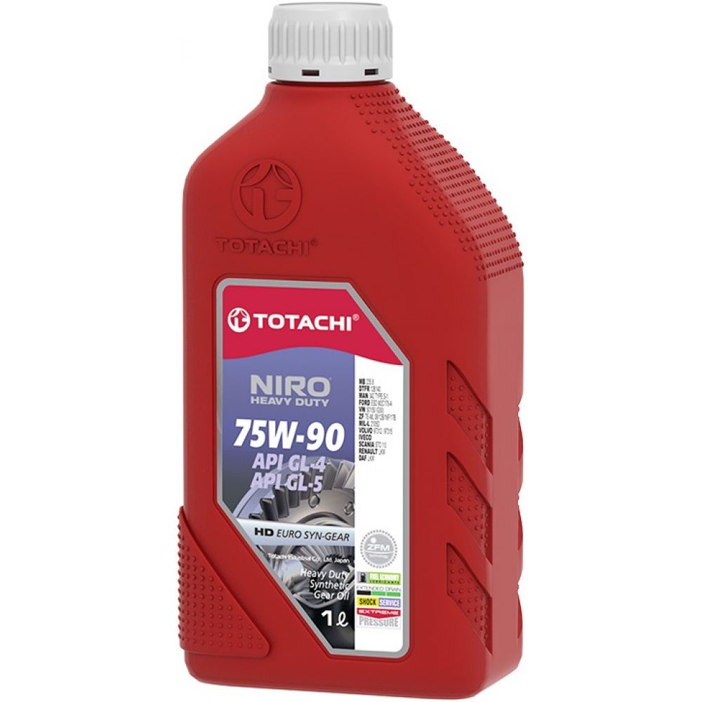 TOTACHI NIRO HD EURO SYN-GEAR 75W-90 GL4, GL-5 соответствует или превосходит гарантийные требования производителей гипоидных зубчатых шестерен, осей, работающих в различных сочетаниях скоростной / ударной нагрузки и низкой скорости / высокого крутящего момента и для синхронизированных и несинхронизированных механических коробок передач легкового, дорожного и внедорожного транспорта, где требуется трансмиссионное масло API GL-4, GL-5 с вязкостью 75W-90. TOTACHI® гарантирует полное соответствие письменным спецификациям, указанным на этикетках продуктов.