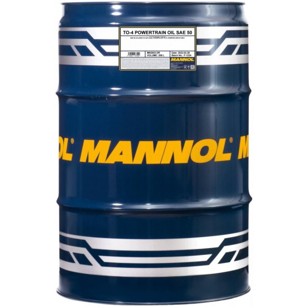 MANNOL 2603 TO-4 POWERTRAIN OIL 50W - специальное всесезонное трансмиссионно-гидравлическое минеральное масло, предназначенное для использования в гидравлических системах, трансмиссиях и коробках передач (в том числе силовых), бортовых редукторах прочих агрегатах внедорожной техники с маслопогруженными тормозами (муфтами) и без.