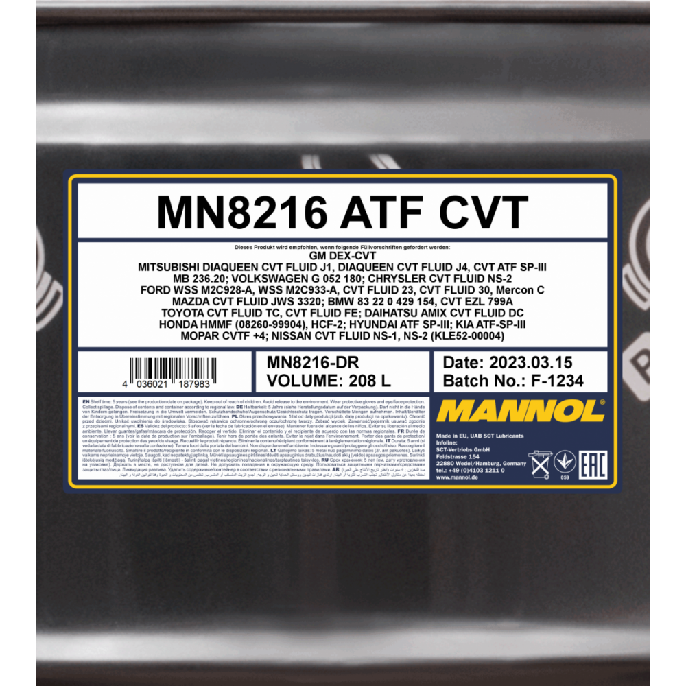 Трансмиссионное масло MANNOL 8216 ATF CVT, 208л