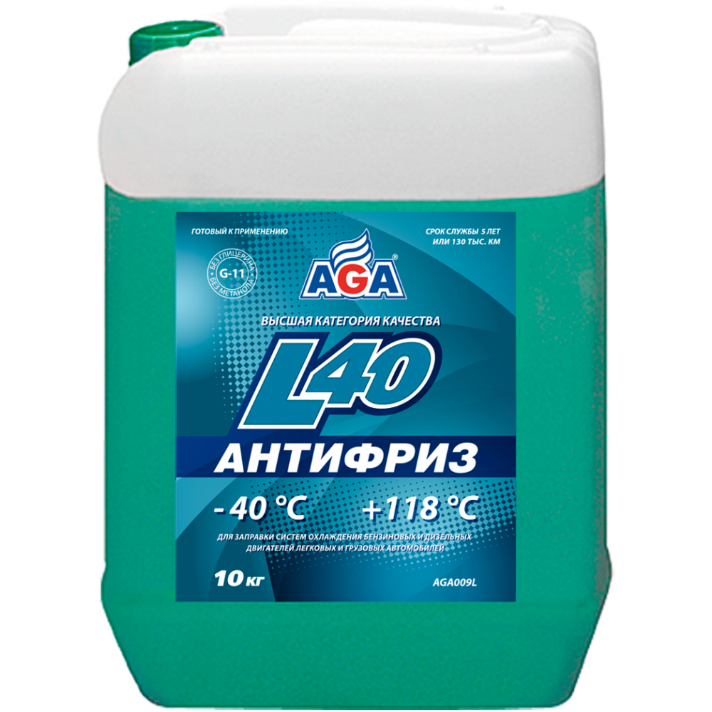 AGA-L40 (тосол) –40 °С, G11 - это готовая к применению охлаждающая жидкость сине-зеленого цвета высшей категории качества. Антифриз L40 не горит, в его составе нет метанола и глицерина.