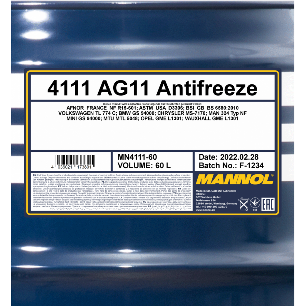 MANNOL 4111 ANTIFREEZE LONGTERM AG11 - концентрированный антифриз на основе минеральных ингибиторов - IAT (Inorganic Acid Technology).